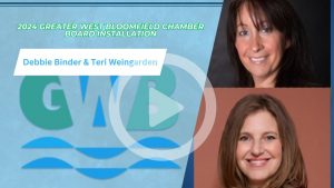 48th District Court Judge Diane D’Agostini joins Tyler Kieft at the 2024 Greater West Bloomfield Chamber of Commerce Board Installation Breakfast, discussing her role in their annual ceremony swearing in the newest members of the Chamber’s Board of Directors, emphasizing that their leadership role is as vital to the community as many in similar leadership roles in local public service.